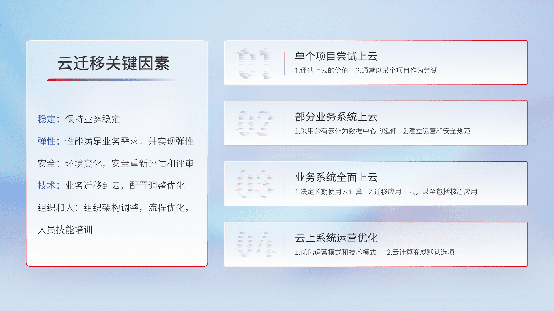 结合实际业务,,,从规划设计、、云平台选型、、、云原生改造、、数据迁移、、集成交付,,迁移全过程为客户识别最佳上云路径,,,,做好风险识别管理,,,设计网络架构、、身份权限、、安全审计合规、、操作审计、、、、日志审计、、监控告警策略、、、多站点容灾设计等,,,,对云上基础设施进行整体规划,,提升IT治理水平,,,以满足弹性、、、、高可用、、、高性能的需求。。