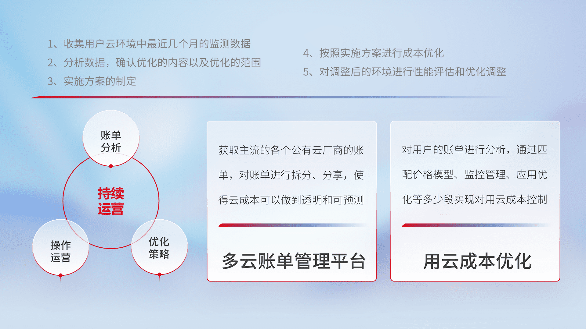 通过灵活运用多种自动化迁移工具,,帮助企业用户实现业务和数据高效 、、、、稳定的上云迁移和云上迁移,,采用自研多云纳管平台,,,,以中立管理模式,,解决多组织、、、多云、、多运维厂商的复杂关系的管理,,,保证多云平台资源配置的一致性,,,实时掌控云资源运行数据,,,,运用智能化工具分析云资源多云平台的管理服务,,,透明化管理成本支出,,用云成本可预测、、、用云费用可优化、、云资源配额有据可依。。