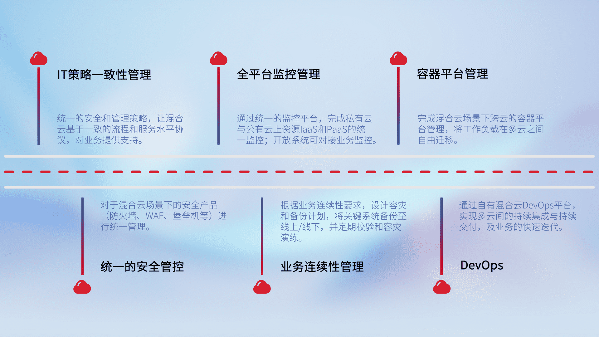 通过多云纳管,,,,以统一的资源数据模型把客户的云资源进行抽象和封装,,进而实现对多云资源的统一操作,,,保障云资源管理的可靠性、、稳定性与可用性。。量身定制化运维内容,,配置、、、开发运维、、、补丁管理、、、备份、、、、监控、、认证和访问管理、、、审计和日常巡检等,,,,保障在用云过程中的可靠度,,,,稳定度以及高可用率。。。。