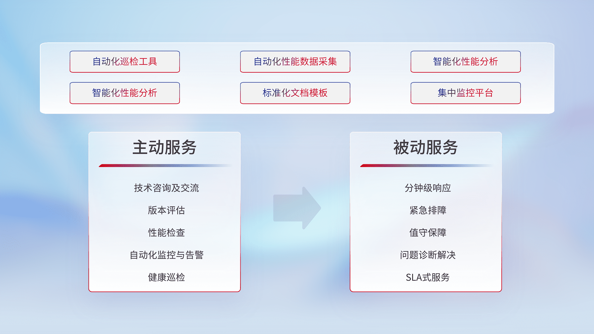 智能化工具和标准化文档,,,保障服务质量,,,提供主动服务(包含技术咨询、、、、版本评估、、性能检查、、、自动化监控与告警、、、健康巡检)和被动服务包含(分钟级响应、、紧急排障、、值守保障、、、、问题诊断解决、、、SLA服务)。。。